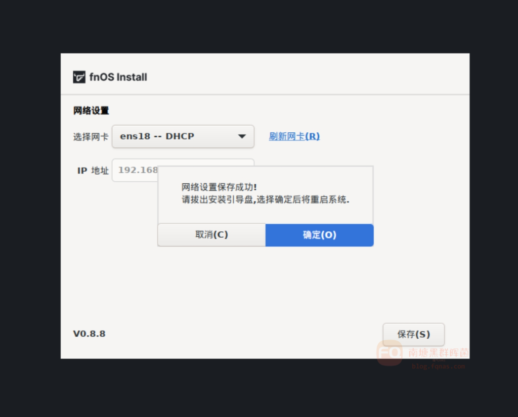 网络设置保存成功后,你可以将引导盘从主机上拔出。回车或 Alt+O 重启系统。
