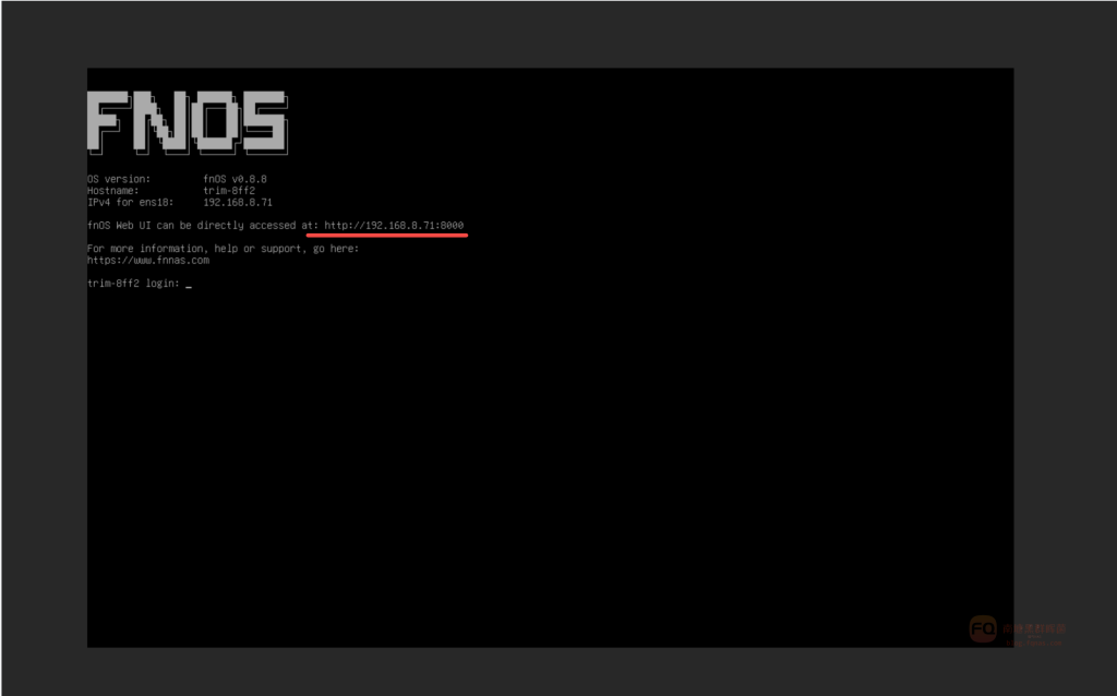 设备重启成功后将自动进入终端登录页,这意味着系统已成功安装并启动!请记住所设置的 IP 地址,接下来你将通过浏览器访问此地址来设置和使用 fnOS。现在你可以将显示器、键盘、鼠标从主机上拔除了。