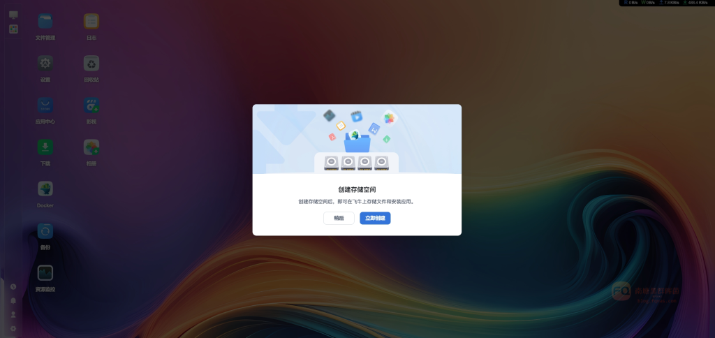建议尽快创建存储空间以便上传文件和安装应用。如果硬盘还没有准备好,也可以点击 稍后 跳过,后续可从 设置 > 存储空间管理 中创建。请参考 如何创建存储空间 以了解更多信息。
