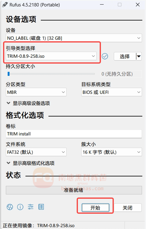 此步骤需要在电脑上使用写盘工具将镜像文件烧录到 U盘中。U 盘在完成安装后就可推出。写盘工具可选择 Rufus (Rufus4.5 下载 👍、Rufus 4.0 下载、Rufus 官网)、Balenaetcher 等。下文以 Rufus 为例: