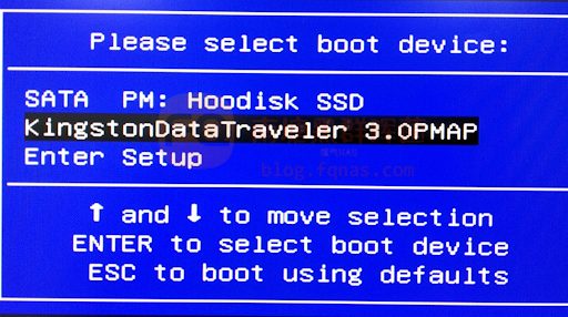 将制作好的引导盘插入到主机的接口。按主机电源开机,开机同时快速按键盘热键进入boot 设备选择界面。不同设备主板进入boot 页面的热键不同,F2、F7、F8、F10、F11、F12、esc 、Delete 键都有可能。