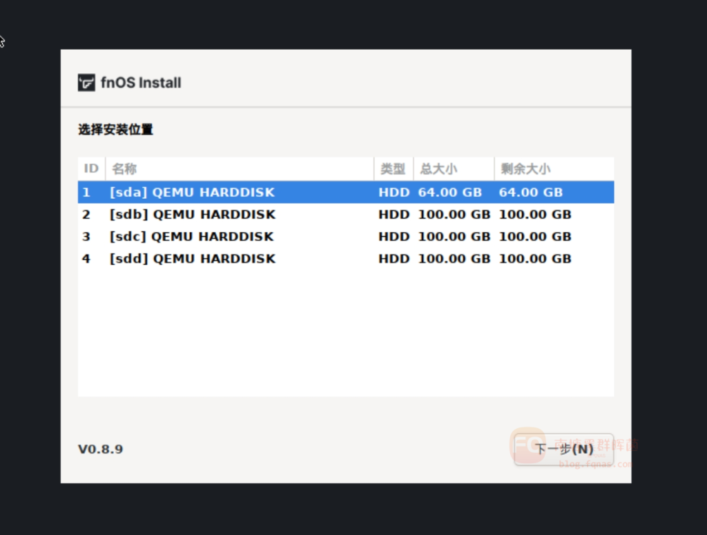 方向键切换选择要用于系统安装的硬盘,回车或 Alt+N 进入下一步。